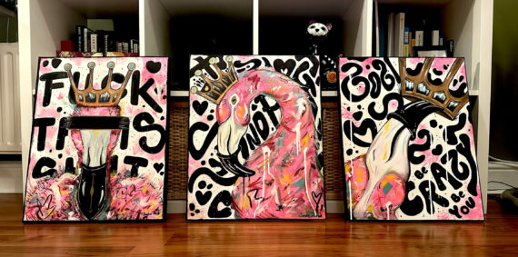 “Flamingo Attitude” is a vibrant series of three expressive paintings…