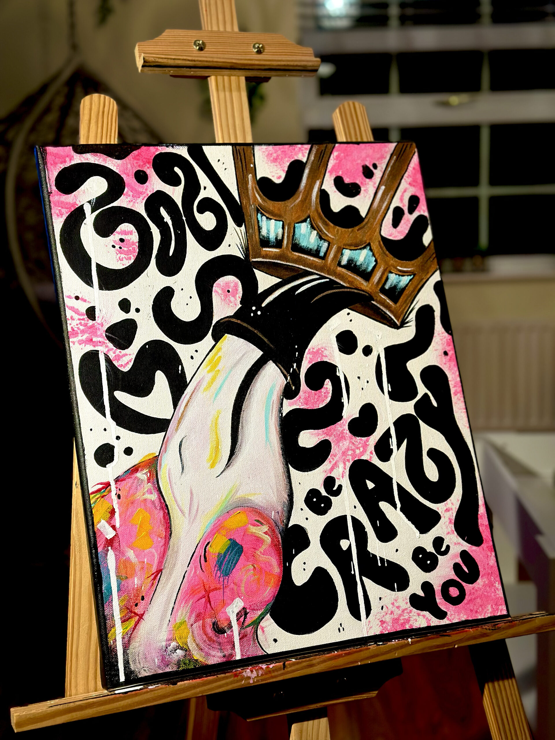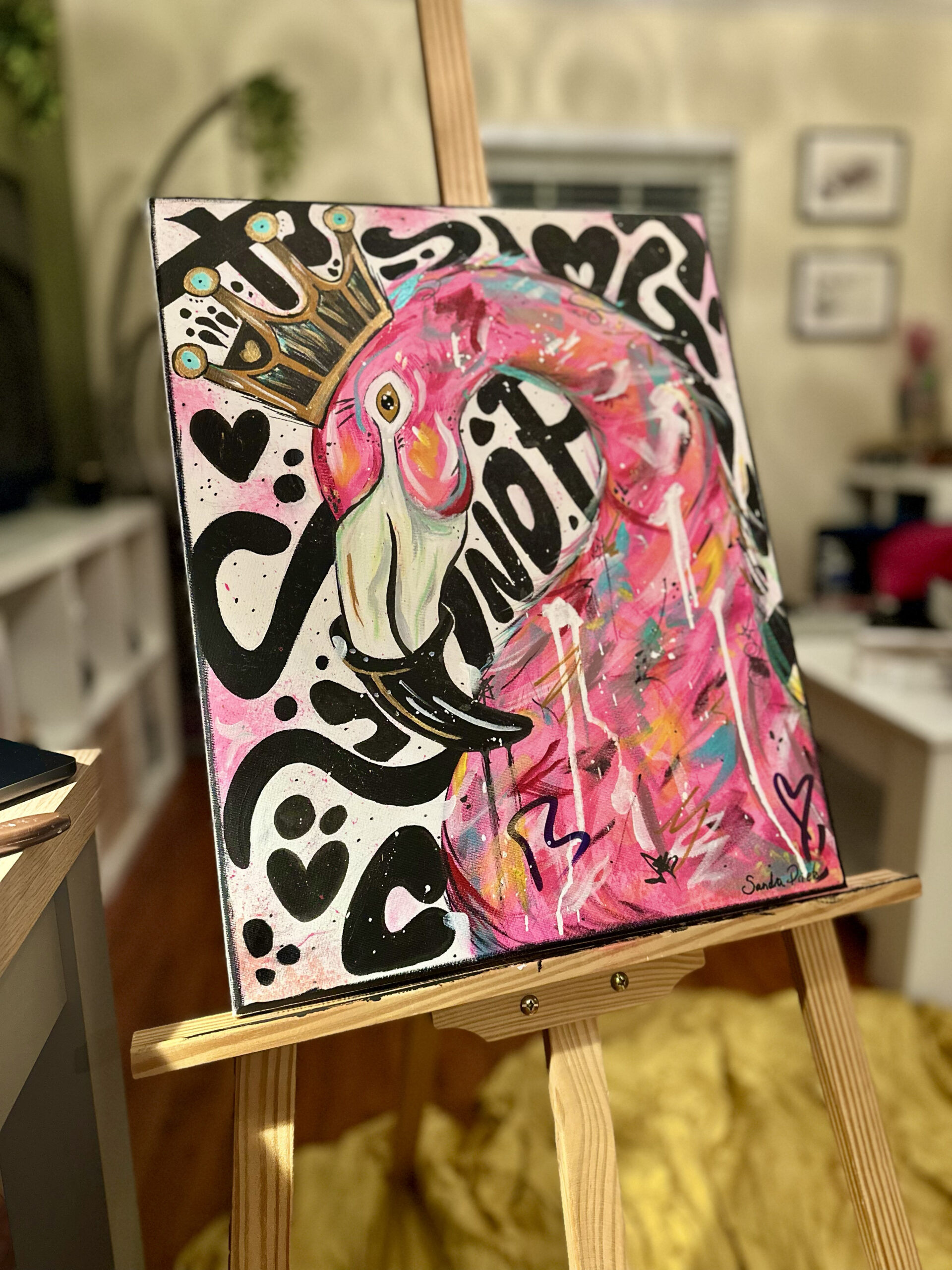“Flamingo Attitude” is a vibrant series of three expressive paintings that blend color, movement, and bold typography to celebrate individuality and creative freedom. Each flamingo becomes a symbol of self-expression — unapologetic, confident, and full of attitude. Through spontaneous brushstrokes, layered textures, and a mix of graffiti-inspired elements, this collection reflects my artistic philosophy: embrace imperfection, celebrate authenticity, and dare to stand out.